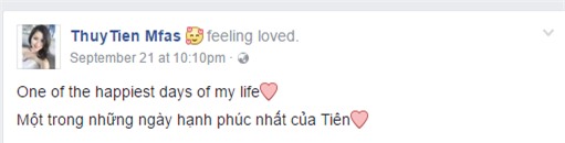 Trước đó, Thủy Tiên cũng đăng tải lên trang cá nhân một dòng status hạnh phúc. Thời gian đó, mọi người cũng "đoán già, đoán non" về việc vợ chồng Thủy Tiên có tin vui. Tuy nhiên, đến hôm nay, Thủy Tiên mới chính thức chia sẻ thông tin về việc vợ chồng cô chuẩn bị đón con đầu lòng.