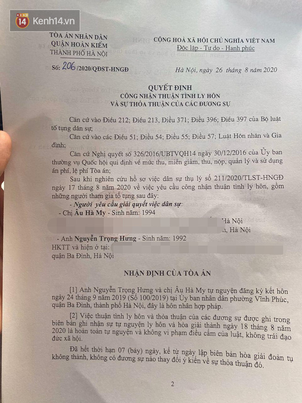 Hôm nay (26/8), vợ chồng Âu Hà My - Nguyễn Trọng Hưng đã chính thức ly hôn sau một thời gian ồn ào. Theo đó cả 2 vợ chồng đã thuận tình chia tay, đơn ly hôn được TAND Quận Hoàn Kiếm xử lý.