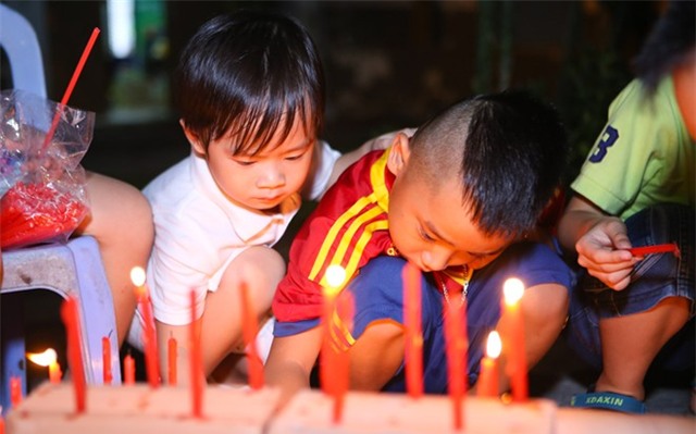 | Trong khi các em chịu sự quản lý của mẹ, anh cả Rio hào hứng tham gia trò đốt nến. Bố Lý Hải hỗ trợ con trai vì sợ con không may bị phỏng. |