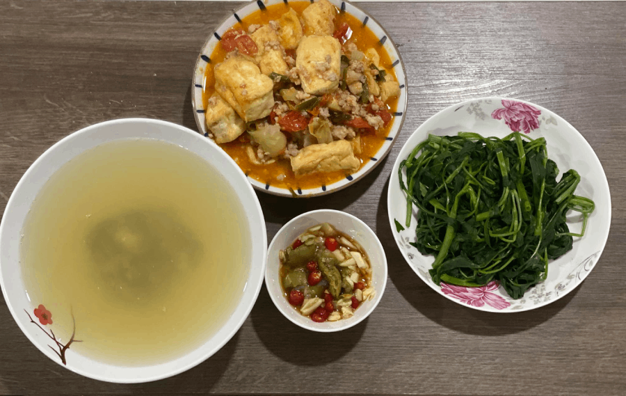 Nhà tôi có 4 người đều thích ăn rau nên mỗi bữa sẽ có một bát canh, một món mặn, có thể thêm một đĩa salad rau củ”.
