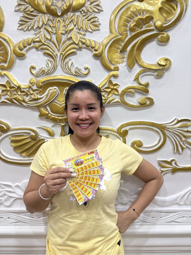 Chị Lan đổi 6 tờ vé số trúng giải độc đắc cho khách hàng may mắn. (Ảnh: FBNV)