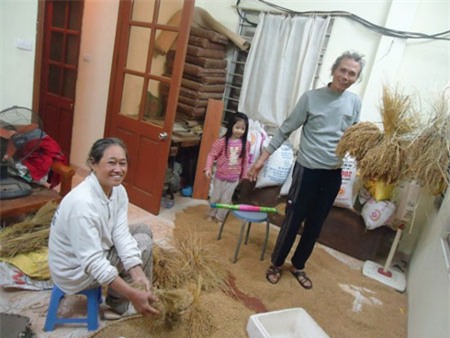 “Một thời gian trước, từ tầng hai lên tầng năm, các cầu thang của căn nhà đều có thóc cả. Nay thóc đã khô gần hết nên tôi đã bỏ vào bao bớt rồi. Số thóc này có khi bằng một gia đình nông dân thu hoạch cả mẫu ruộng. Anh thấy cả nước Việt Nam mình, chứ chưa nói đến ở riêng Hà Nội, rồi lại giữa lòng Thủ đô, có ai yêu lao động, mót được nhiều thóc như vợ chồng chúng tôi không?”, chủ nhà tự hào.
