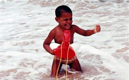 Trong bức ảnh thời thơ ấu, Tổng thống Barack Obama khi đó chỉ là một cậu bé con, tươi cười đùa giỡn với sóng biển.