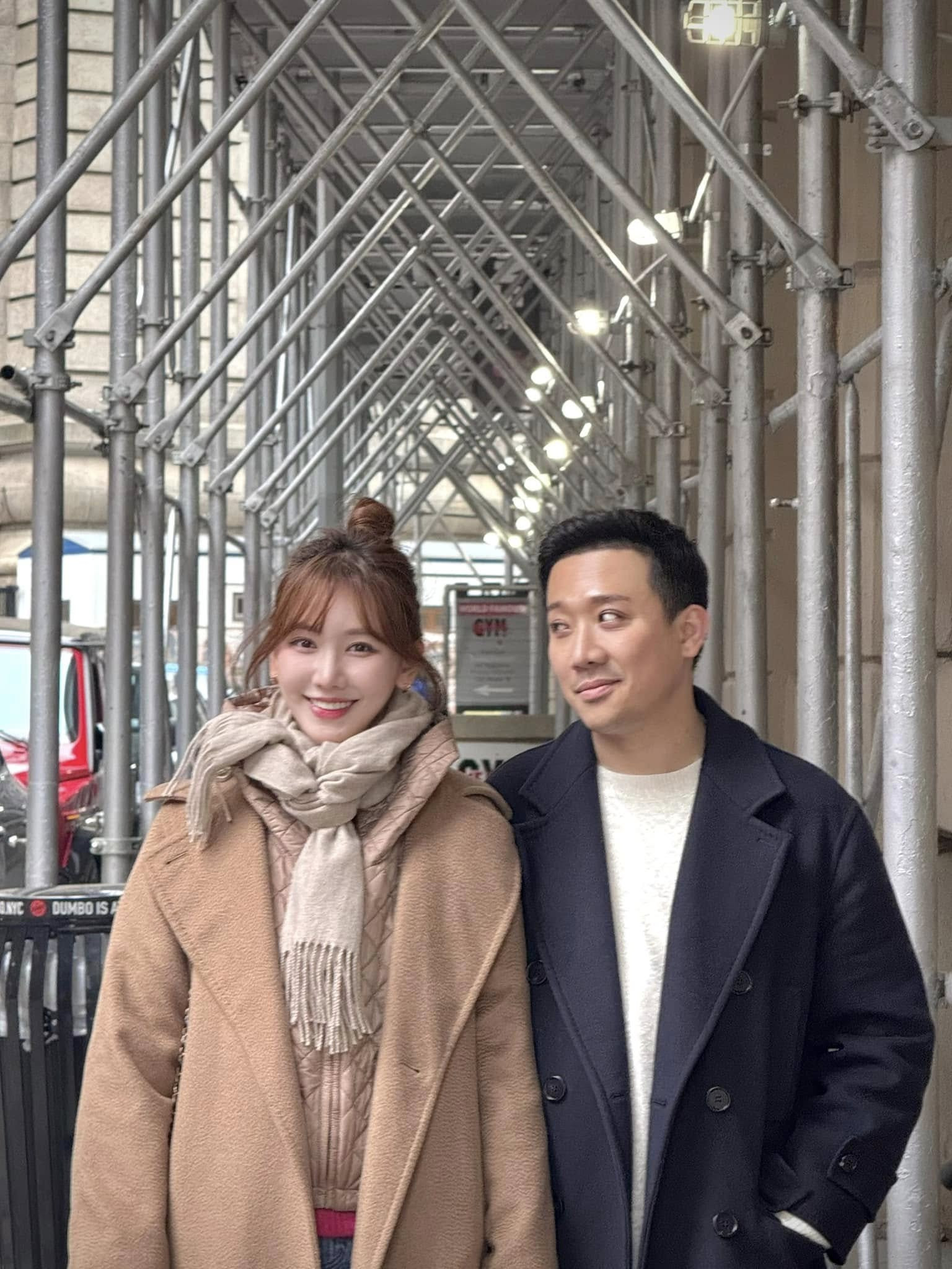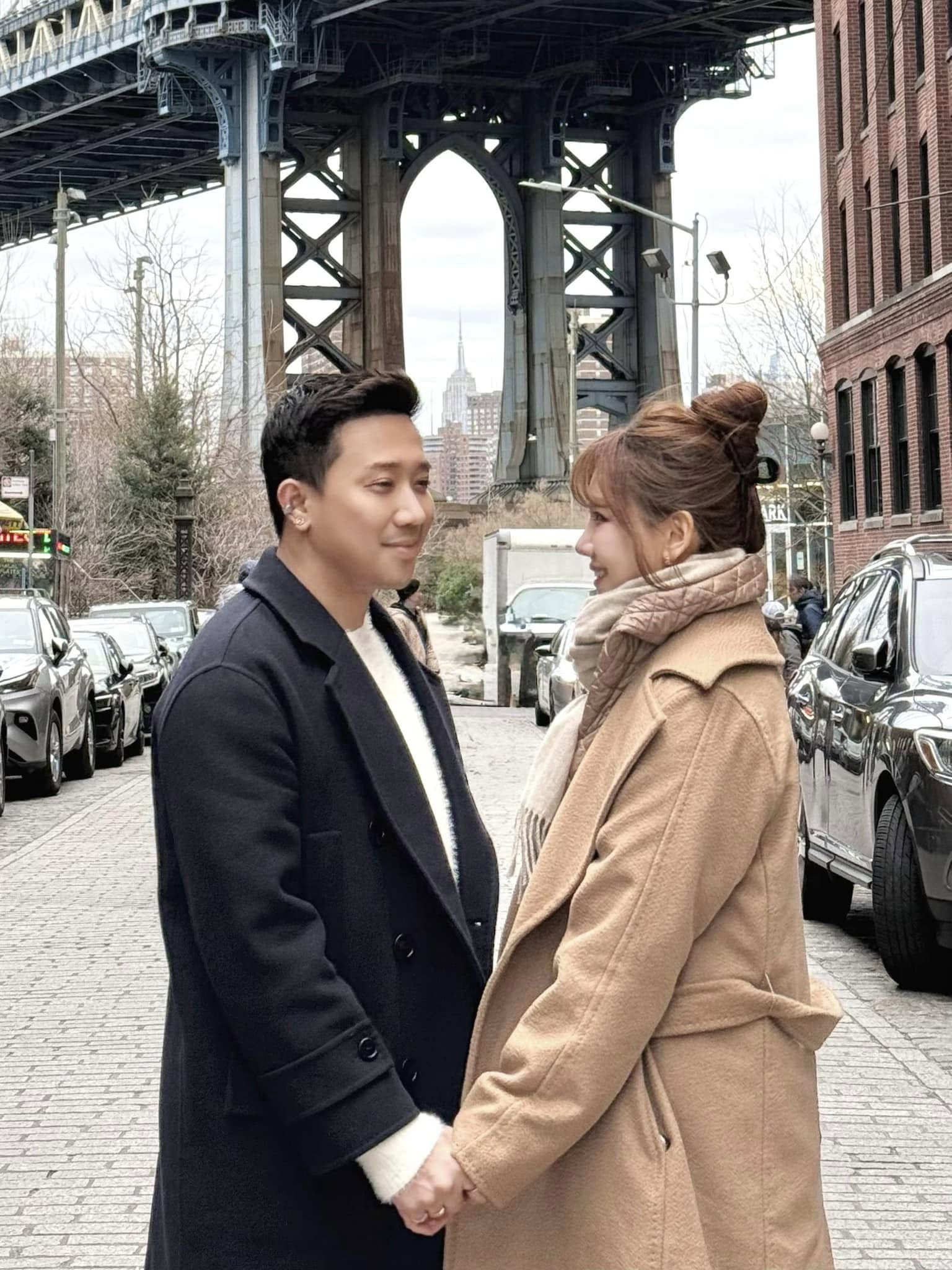 Hari Won và Trấn Thành cùng diện măng tô với quần jeans để tận hưởng không khí lạnh của New York khi sang xuân.