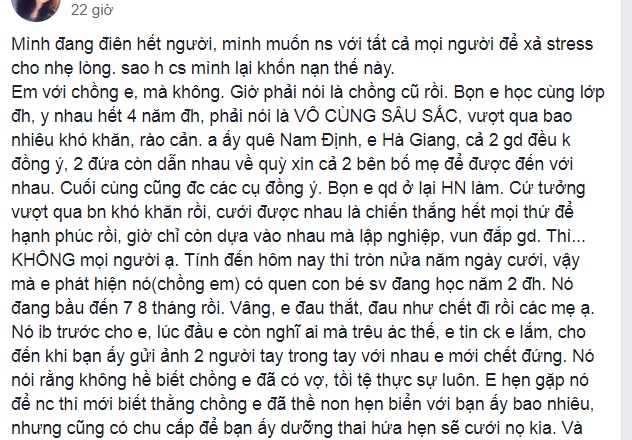 Tính đến hôm nay thì tròn nửa năm ngày cưới, vậy mà e phát hiện nó (chồng em) có quen con bé sinh viên đang học năm 2 đại học. Nó đang bầu đến 7, 8 tháng rồi. Vâng, em đau thắt, đau như chết đi rồi các mẹ ạ. Nó inbox trước cho em, lúc đầu em còn nghĩ ai mà trêu ác thế, em tin chồng em lắm, cho đến khi bạn ấy gửi ảnh 2 người tay trong tay với nhau em mới chết đứng. Nó nói rằng không hề biết chồng em đã có vợ, tồi tệ thực sự luôn. Em hẹn gặp nó để nói chuyện thì mới biết chồng em đã thề non hẹn biển với bạn ấy bao nhiêu, nhưng cũng có chu cấp để bạn ấy dưỡng thai hứa hẹn sẽ cưới nọ kia. Và trong suốt thời gian đấy nhà em vẫn yên ấm, vẫn thương yêu, quan tâm em vô cùng. Chuyện càng hơn thế nữa, khi bồ nói đi khám sức khỏe tiền sản thì phát hiện bị ung thư cổ tử cung giai đoạn đầu. Em sốc thực sự. Và nó nói nó cần anh ý để quan tâm chăm sóc hai mẹ con, trong khi nó đang bị bệnh. Em cũng điên giờ chưa biết làm thế nào, liệu nó có giả bệnh để em thương hại không? Em chưa có con, liệu có nên nhường chồng lại hay không? Bây giờ cảm xúc em đang hỗn độn, yêu, hận, căm thù chồng em lắm. Còn con bé kia ư, em phải kiềm chế nhiều lắm..."