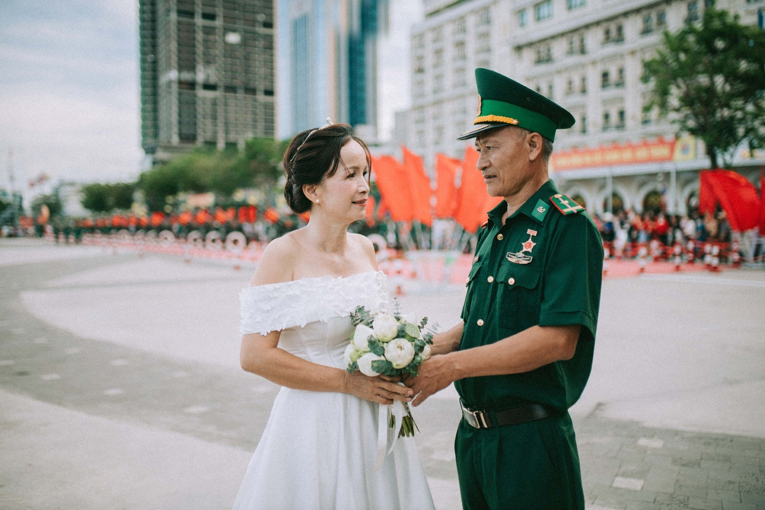 Trong chiếc váy trắng lộng lẫy và bộ quân phục, vợ chồng ông Liêm một lần nữa trở thành cô dâu, chú rể đẹp nhất trong mắt nhau.