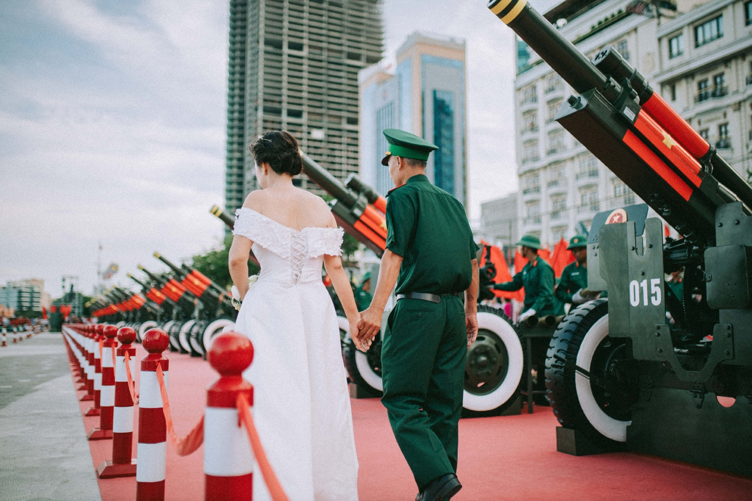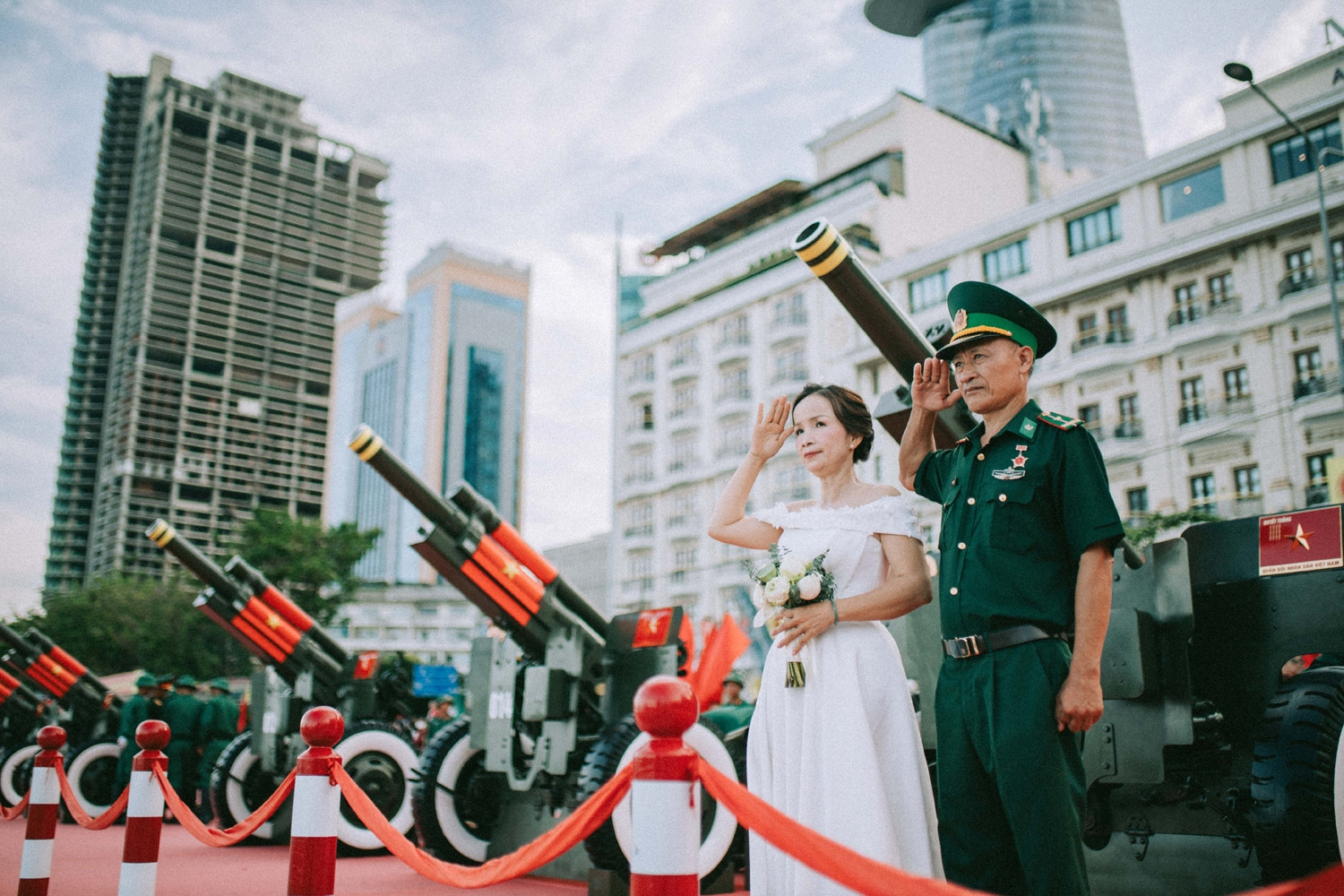 Những ngày qua, công viên bến Bạch Đằng (quận 1, TPHCM) với dàn đại bác chuẩn bị cho đại lễ 30/4 trở thành địa điểm ấn tượng được nhiều cặp đôi chọn để chụp ảnh cưới. Sự kiện trọng đại của cuộc đời được ghi dấu tại nơi đầy hào khí dân tộc là điều nhiều bạn trẻ hằng mong.