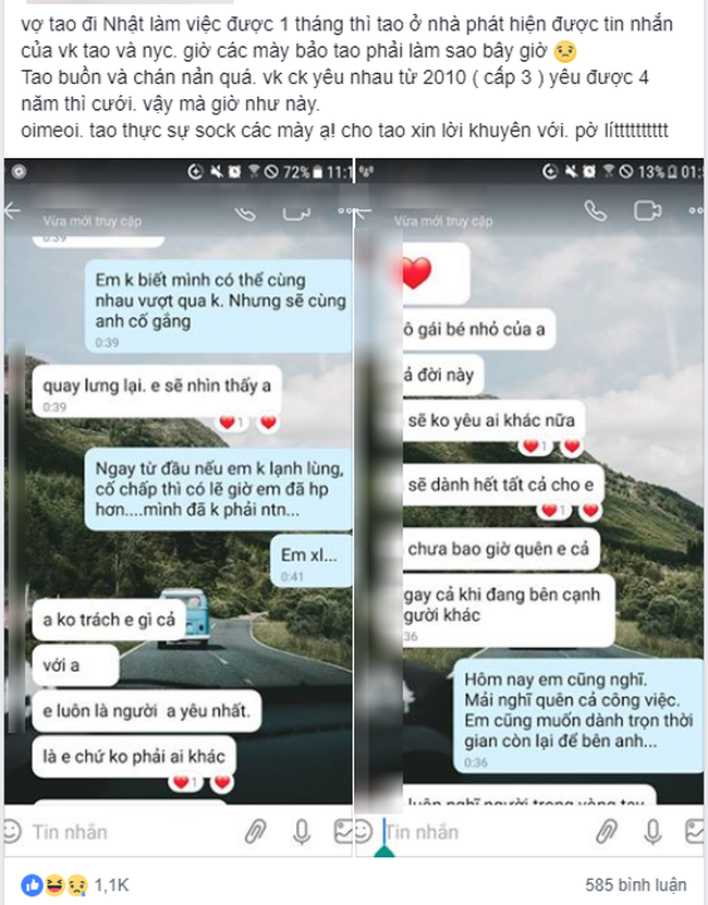 "Vợ mình đi Nhật làm việc được 1 tháng thì mình ở nhà phát hiện được tin nhắn của vợ mình và người yêu cũ. Giờ các bạn bảo mình phải làm sao bây giờ?