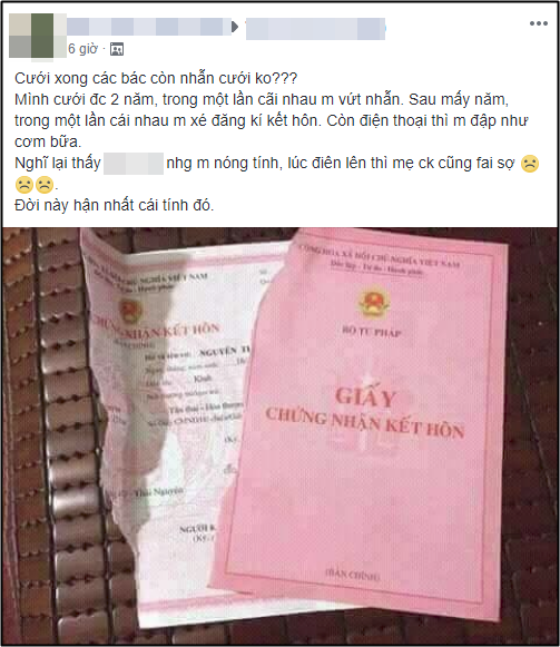 "Cưới xong các bác còn nhẫn cưới không? Mình cưới được 2 năm, trong một lần cãi nhau mình vứt nhẫn. Sau mấy năm, trong một lần cãi nhau mình sẽ đăng kí kết hôn. Còn điện thoại thì mình đập như cơm bữa. Nghĩ lại thấy ngốc nhưng mình nóng tính, lúc điên lên thì mẹ chồng cũng phải sợ. Đời này hận nhất cái tính đó."