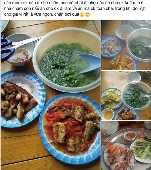 Than thở "Mình ở nhà chăm con, nấu ăn cho chồng đi làm về ăn mà chồng toàn chê. Trong khi đó mình cho gia vị rất là vừa ngon", N.C còn không quên đăng tải thêm vài bức ảnh mâm cơm làm bằng chứng.