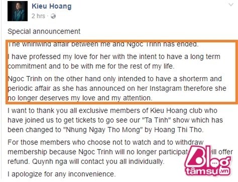Tuy nhiên, mới đây Hoàng Kiều đã chính thức tuyên bố chia tay Ngọc Trinh khiến nhiều người hoảng hốt. Cụ thể ông nói: