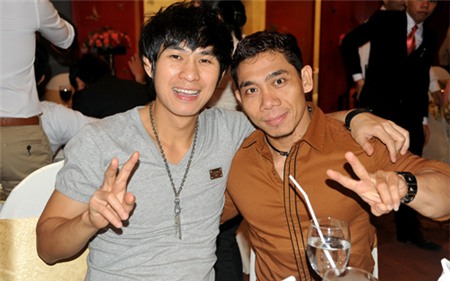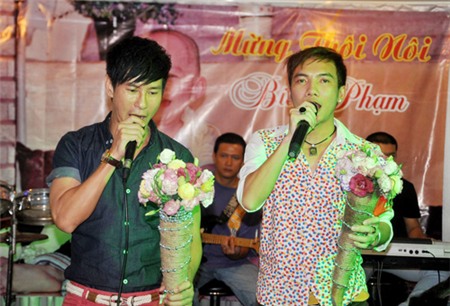 | Hai ca sĩ Hồ Quang Hiếu và Ngô Trác Lâm khuấy động không khí của buổi tiệc bằng những ca khúc nhạc dance sôi động. |