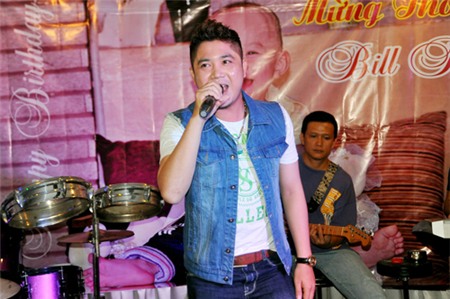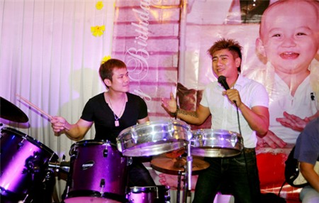 | Vân Quang Long đánh trống cho đồng nghiệp Trương Đan Huy hát. |