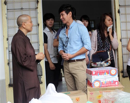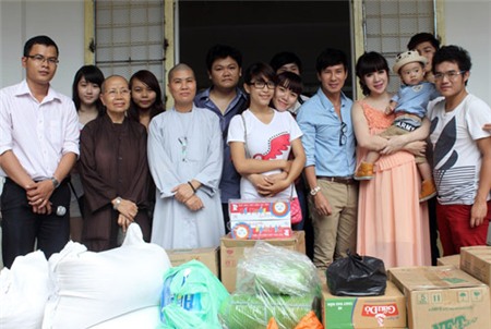 | Vợ chồng Lý Hải trao tặng những phần quà cho các sư cô tại chùa. |