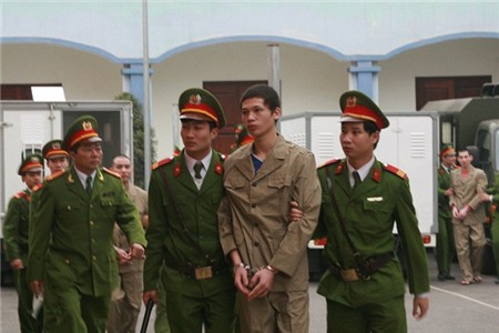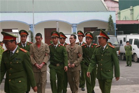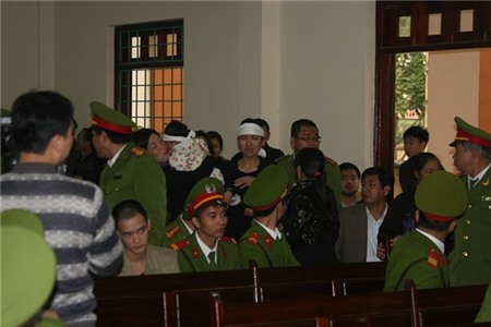 | 8h ngày 6/3, các bị cáo được dẫn giải vào phòng xử án của TAND tỉnh Vĩnh Phúc để xét xử phiên phúc thẩm vụ quan tài diễu phố. |