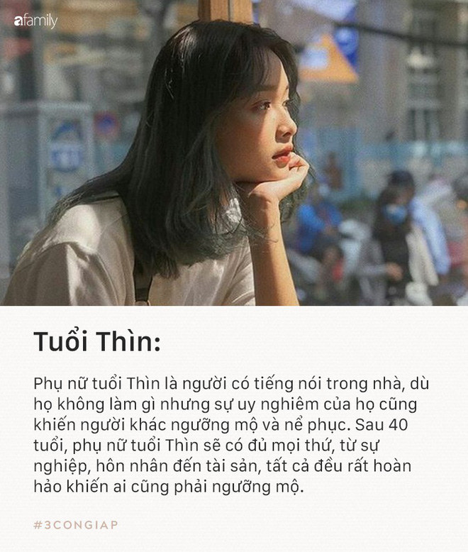 Trong số 12 con giáp, tuổi Thìn là con giáp vốn đã có mệnh phú quý. Khi sinh ra, họ luôn được yêu thương, chăm sóc hết mực, vì vậy cũng có bướng bỉnh, cứng đầu. Tuy nhiên, trời sinh tuổi Thìn có trí thông minh tuyệt vời, nếu chẳng may có sở hữu tính tình không tốt đều là do hoàn cảnh đưa đẩy. Nhưng nhìn chung, phụ nữ tuổi Thìn là người có chí lớn, họ biết tính toán và sáng tạo, biết làm gì để cuộc sống mình đạt được nhiều thành công. Bước vào giai đoạn trung niên, phụ nữ tuổi Thìn thường thành đạt trong sự nghiệp, có lúc khiến người chồng cảm thấy mất tự tin. Tuy nhiên, đối với cuộc sống gia đình, họ lại là người phụ nữ dịu dàng, biết lo cho chồng con. Phụ nữ tuổi Thìn là người có tiếng nói trong nhà, dù họ không làm gì nhưng sự uy nghiêm của họ cũng khiến người khác ngưỡng mộ và nể phục. Sau 40 tuổi, phụ nữ tuổi Thìn sẽ có đủ mọi thứ, từ sự nghiệp, hôn nhân đến tài sản, tất cả đều rất hoàn hảo khiến ai cũng phải ngưỡng mộ.