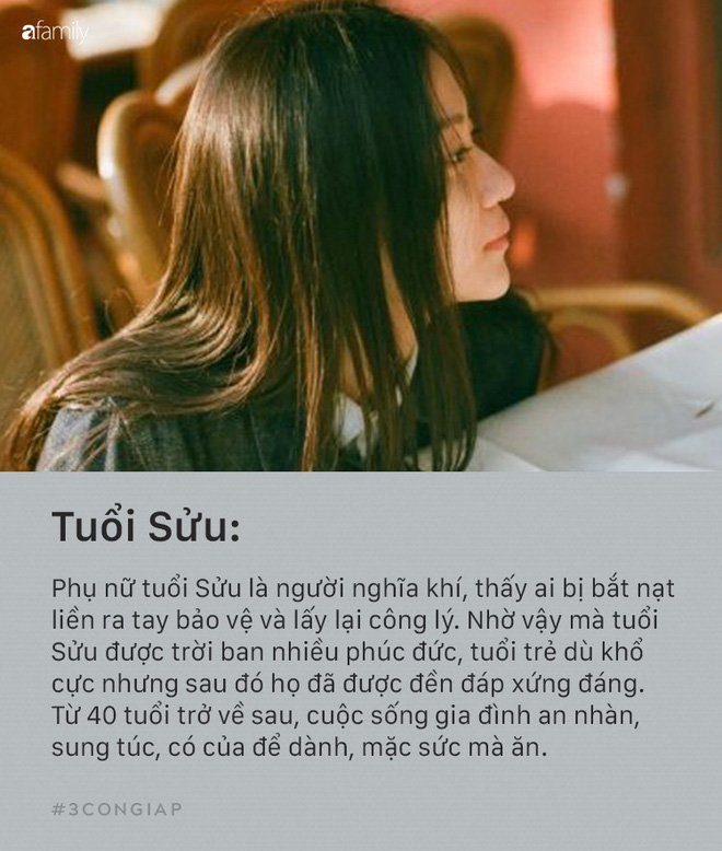 Ông bà ngày xưa cho rằng, chồng nào cưới được vợ tuổi Sửu được xem như hưởng phúc đức 3 đời. Trời sinh nữ tuổi Sửu hiền lành, chăm chỉ, họ nói ít nhưng làm nhiều và mọi thứ đều được hoàn thành một cách tốt đẹp. Phụ nữ tuổi Sửu có sự sáng tạo của riêng mình, luôn hướng về phía trước và cố gắng hoàn hảo mọi thứ. Tuổi Sửu tâm niệm, cuộc sống sung sướng hay vất vả đều nằm trong bàn tay, có làm thì mới có ăn, họ sống trung thực, rõ ràng và không thích mắc nợ bất cứ ai. Bên cạnh đó, phụ nữ tuổi Sửu còn là người nghĩa khí, thấy ai bị bắt nạt liền ra tay bảo vệ và lấy lại công lý. Nhờ vậy mà tuổi Sửu được trời ban nhiều phúc đức, tuổi trẻ dù khổ cực nhưng sau đó họ đã được đền đáp xứng đáng. Sau khi kết hôn, tuổi Sửu lại được chồng con yêu thương hết mực, là một người vợ, người mẹ có trách nhiệm, vì vậy mà phúc khí lại càng nhiều hơn. Từ 40 tuổi trở về sau, cuộc sống gia đình an nhàn, sung túc, có của để dành, mặc sức mà ăn.