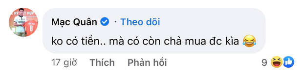 Đáp lại lời ngỏ ý của vợ, ngay dưới phần bình luận, Mạc Hồng Quân thẳng thắn: "Không có tiền, mà có cũng chẳng mua được kìa". Khi trò chuyện với bạn bè, Kỳ Hân cũng tiết lộ: "Nhà em làm gì còn tiền đâu mà hốt".