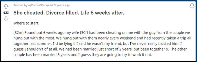 Khi phát hiện ra vợ thường xuyên qua lại với chồng của bạn thân, người đàn ông 32 tuổi này đã hoàn toàn chết lặng. Chỉ mới lấy vợ được 2 năm thôi nhưng cuộc sống của anh như trong địa ngục. Câu chuyện bản thân được người chồng chia sẻ trên Reddit.