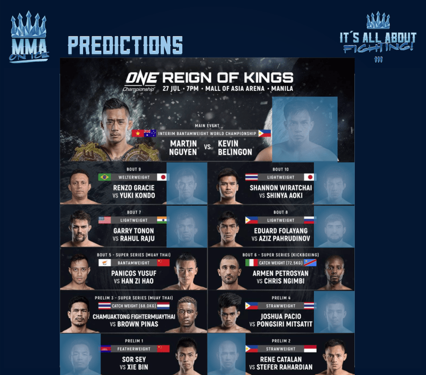 Với tính chất tranh đai nên trận đấu giữa Martin Nguyễn và Kevin Belingon được chọn là trận đấu tâm điểm trong sự kiện ONE: REIGN OF KINGS diễn ra tại võ đài Mall of Asia, Manila, Philippines.
