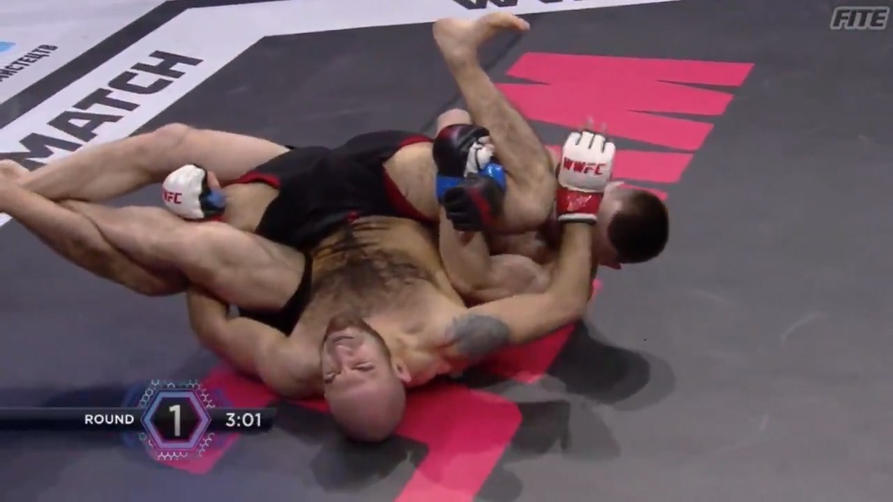 Pha khóa siết độc đáo diễn ra trong màn so tài giữa võ sĩ Kirill Gorobets (thắng 8 thua 1) và đối thủ Gasan Azizov (thắng 5 thua 3) tại giải võ thuật WWFC vào cuối tuần qua.