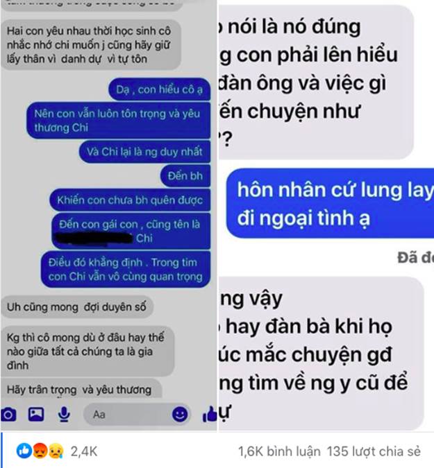 Theo đó, trong tin nhắn người vợ đọc được, chồng mình khẳng định với mẹ người yêu cũ rằng: "Con vẫn luôn tôn trọng và yêu thương Chi. Và Chi lại là người duy nhất đến bây giờ con chưa bao giờ quên được. Đến con gái con, cũng tên là Chi. Điều đó khẳng định, rong tim con, Chi vẫn vô cùng quan trọng".