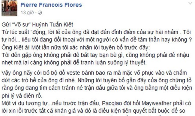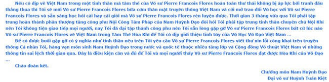 "Để có được buổi gặp gỡ có ý nghĩa như tinh thần nêu trên, tôi yêu cầu võ sư Pierre Francois Flores viết thư xin lỗi công khai trên truyền thông tới cá nhân tôi, hàng vạn môn sinh Nam Huỳnh Đạo trong nước và quốc tế thuộc nhiều tầng lớp và cộng đồng võ thuật Việt Nam vì những thông tin sai lệch thời gian qua.