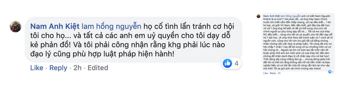 2. Ngay sau khi clip hơn 21 giây ghi lại cảnh Nam Anh Kiệt đánh Nam Nguyên Khánh được phát tán lên mạng, nguyên Tổng đàn chủ Vịnh Xuân Nam Anh đã có những lời thanh minh bằng tài khoản mạng xã hội của mình "Họ cố tình lẩn tránh cơ hội tôi cho họ... và tất cả các anh em ủy quyền cho tôi dạy dỗ kẻ phản đồ! Và tôi phải công nhận rằng không phải lúc nào đạo lý cũng phù hợp luật pháp hiện hành!".