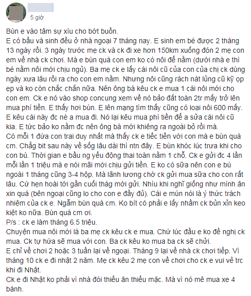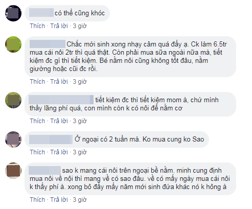 P/s: Chồng em làm tháng 6,5 triệu. Chuyện mua nôi mới là ba mẹ chồng kêu anh mua. Chứ lúc đầu em không đề nghị. Chồng tự hứa sẽ mua cho con. Ba chồng kêu không mua ba sẽ chửi.