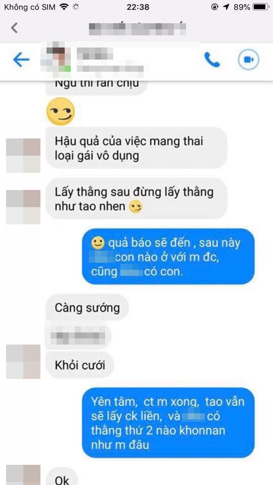 "Ngày nào, mày cũng mong con gái, giờ được con thì mất chồng. Chúc mừng nhé, tao không tiếc gì mày, thích là bỏ. Xa mày, tao ở một mình hay cặp bồ với ai cũng hạnh phúc, cho mày biết cái giá của việc đẻ con gái.