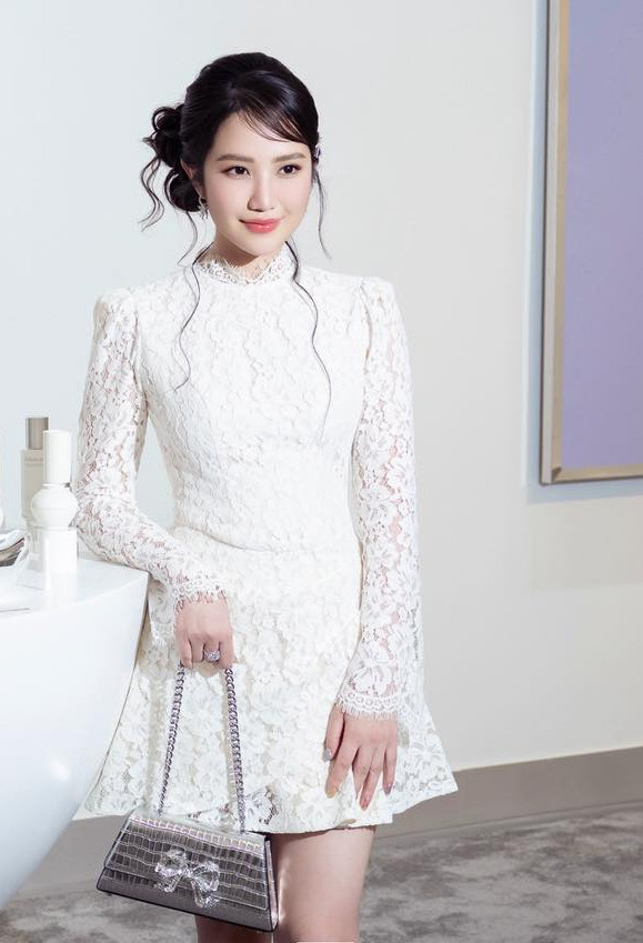 Tại đây, tiểu thư đình đám Sài thành diện chiếc chiếc đầm màu trắng thanh lịch với thiết kế ren, trang điểm nhẹ nhàng khoe khéo vòng eo thon gọn và đôi chân dài thon thả.