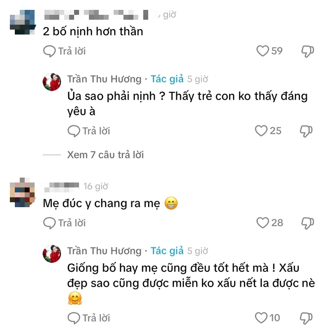 Đáng chú ý, phía dưới phần bình luận có một netizen cho rằng Soobin Hoàng Sơn và Binz nịnh nọt con trai của Tuấn Hưng. Trước nhận xét này, Hương Baby đã ngay lập tức tỏ rõ thái độ gay gắt: "Ủa sao phải nịnh. Thấy trẻ con không thấy đáng yêu à". Ở một bình luận khác, nữ doanh nhân cũng thẳng thắn nêu rõ quan điểm khi netizen nhận xét ngoại hình của con trai: "Giống bố hay mẹ cũng đều tốt hết mà. Xấu đẹp sao cũng được, miễn không xấu nết là được nè".