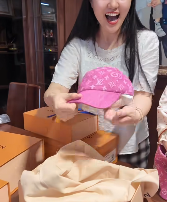 5 món đồ hiệu Louis Vuitton gồm: 2 mẫu túi, hai chiếc mũ và một đôi giày đều mang sắc hồng nổi bật.