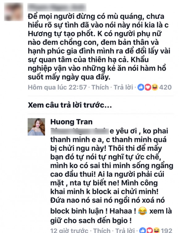 Trước lời đáp trả của Bảo Thanh, vợ Việt Anh lại tiếp tục bóng gió lên tiếng mỉa mai. Cụ thể là khi trả lời bình luận của một người bạn trên facebook ngụ ý chê bai những người bênh vực Bảo Thanh vì ngưỡng mộ nhân vật trong phim và chỉ trích vợ Việt Anh, Hương Trần – vợ Việt Anh đã châm biếm: “Vẫn còn cao giọng lắm chị ơi!”. Trong một bình luận khác Hương Trần cũng cho biết, bản thân không làm sai nên sẽ không khoá bình luận. Cô khẳng định bản thân ngẩng cao đầu sống, ai sai thì “cúi mặt và tự biết”.