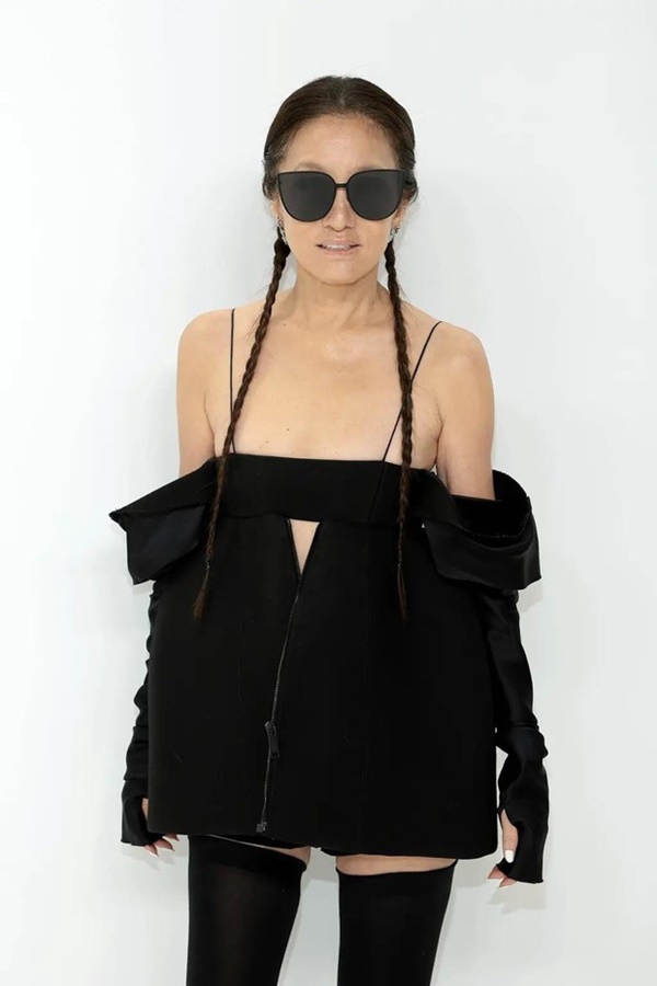 Bà Wang mặc set đồ đen, gồm áo crop-top hai dây cut-out, quần short phối với đôi giày cao gót "khủng" và tất đùi che gần hết chân. Bà đeo kính râm che gần nửa mặt, tóc tết hai bên (Ảnh: GC Images)