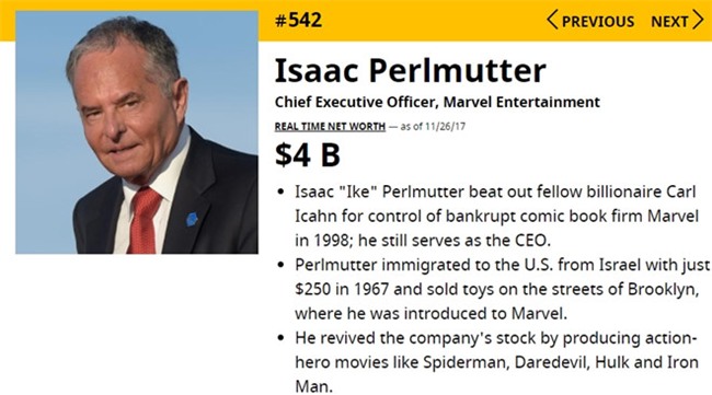 Ông chủ của hãng truyện tranh đình đám này chính là Isaac Perlmutter, đế chế Marvel Comic được biết đến trên toàn thế giới. Tuy nhiên, theo thống kê của Forbes, ông chủ của các “siêu anh hùng” hiện nay, cũng chỉ sở hữu khối tài sản xấp xỉ 4 tỷ USD.