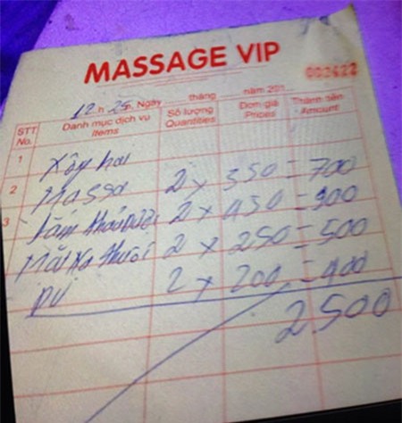 Xuống quầy thanh toán, dù đã chuẩn bị tâm lý trước sẽ bị “chặt chém”, nhưng chúng tôi vẫn bị sốc trước số tiền phải trả. Hóa đơn tên Massage VIP (không ghi địa chỉ quán) ghi số tiền lên tới 2,5 triệu đồng, bao gồm: massage 350 nghìn đồng/người, 2 người 700 nghìn đồng; Tắm thảo dược 450 nghìn đồng/người, 2 người 900 nghìn đồng; Mặt nạ thuốc 250 nghìn đồng/người, 2 người 500 nghìn và phí dịch vụ 200 nghìn/người.