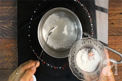 ![]() | ![]() Đun ấm 200ml nước sạch và 30ml giấm, 30g đường, 10g muối rồi để nguội. |