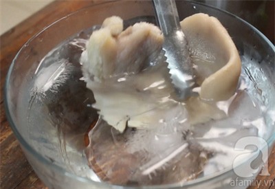 ![]() | ![]() Luộc tai heo trong hỗn hợp nước, giấm, đường, muối, tỏi, gừng, hành tím trong khoảng 5 phút. Sau đó vớt ra ngâm vào nước đá lạnh. |