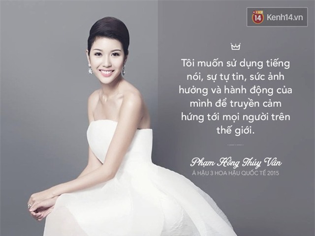 Nếu được trở thành Hoa hậu Quốc tế 2015, tôi sẽ có cơ hội biến giấc mơ ấy trở thành sự thực. Tôi sẽ sử dụng tiếng nói, sự tự tin, sức ảnh hưởng và hành động của mình để truyền cảm hứng tới mọi người trên thế giới, giúp con người ta tin tưởng hơn vào những hy vọng và mơ ước. Tôi muốn làm những điều ấy cho Việt Nam - quê hương tôi, cho Nhật Bản và cho một thế giới tươi đẹp hơn, một thế giới không chiến tranh và cường quyền, một thế giới chỉ có hòa bình và hạnh phúc.