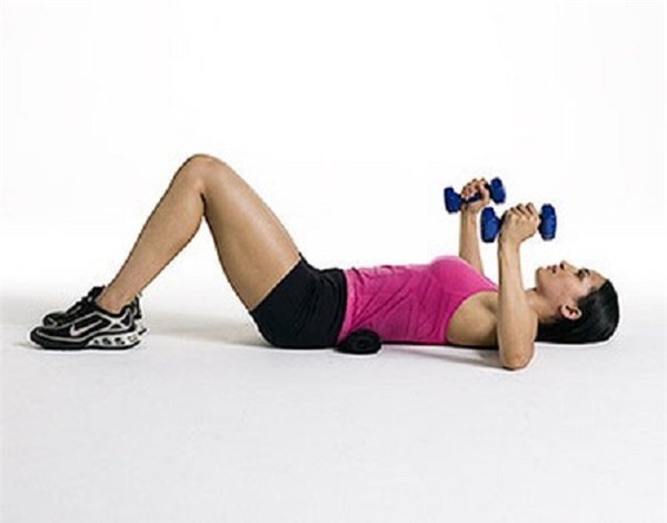 Bạn nằm áp lưng mặt sàn, gập đầu gối, bàn chân đặt phẳng trên sàn, hai cánh tay giang hai bên, mỗi bên nắm một quả tạ (tùy theo sức mà chọn tạ nặng hay nhẹ). Hít vào thở ra đều đặt, từ từ nâng hai tạ lên cao, song song với trần nhà đến khi hai tay chạm nhau. Giữ trong 60s sau đó trở về vị trí ban đầu.