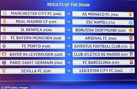 Benfica gặp Borussia Dortmund, hai đội gặp nhau đúng một lần ở lần ở C1 và cách đây hơn nửa thế kỷ (1963/14). Đội bóng của Bồ Đào Nha Porto sẽ đối đầu với Juventus, trong khi Bayer Leverkusen đối đầu Atletico Madrid. Đoàn quân của Simeone năm ngoái lọt vào chung kết C1, nhưng các đội bóng Tây Ban Nha thường khá kị giơ với các đối thủ đến từ Đức nên Atletico Madrid cũng không thể mỉm cười khi lá thăm may rủi cho họ đối thủ Bayer Leverkusen.