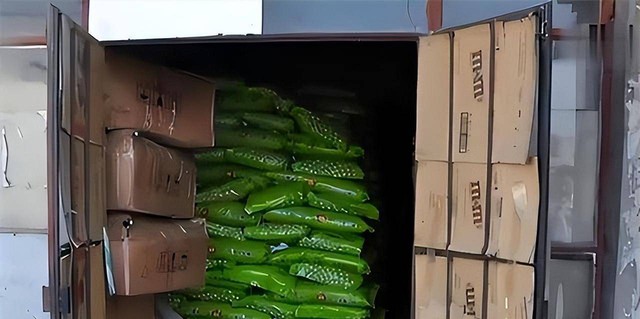 Cảnh sát tìm thấy nhiều túi giấy khả nghi có chứa một ít bột màu trắng bên trong giữa đống bao đựng nông sản.