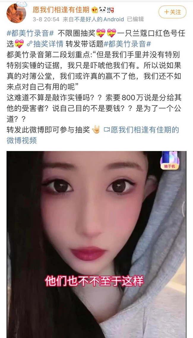 Được biết trước đó không lâu, người bạn tên Lý Ân của Đô Mỹ Trúc cũng đăng bài vạch trần âm mưu của hotgirl. Trong đoạn ghi âm ngày 6/3, bạn gái cũ của Ngô Diệc Phàm hé lộ: "Anh ta chắc chắn chưa từng ngủ với trẻ vị thành niên. Tớ đã nói với anh ta là tớ có bằng chứng trong tay. Ban đầu tớ ra giá 8 triệu tệ, lúc ấy tớ nghĩ anh ta thật sự bất ngờ, chắc chắn trong lòng đã nghĩ đến chuyện tìm đâu ra 8 triệu tệ đây".