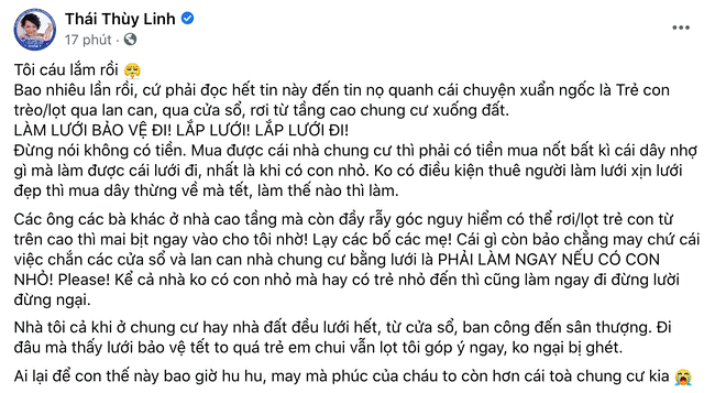 Ca sĩ Thái Thùy Linh kêu gọi các phụ huynh hãy lắp lưới bảo vệ ngay lập tức.