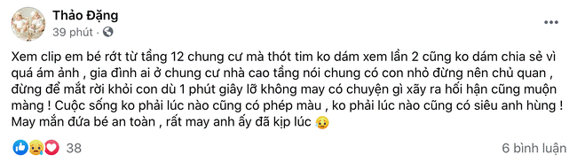 Hoa hậu Đại Dương Đặng Thu Thảo, diễn viên Minh Tiệp cũng lên tiếng nhắc nhở, góp ý tất cả những người làm cha, làm mẹ đang sống ở chung cư cao tầng cần hết sức lưu ý, không được lơ là dù chỉ là 1 giây, 1 phút kẻo ân hận cả đời. Diễn viên Minh Tiệp còn gửi lời cảm ơn anh Nguyễn Ngọc Mạnh vì đã có hành động nghĩa hiệp, đúng lúc để cứu cháu bé.