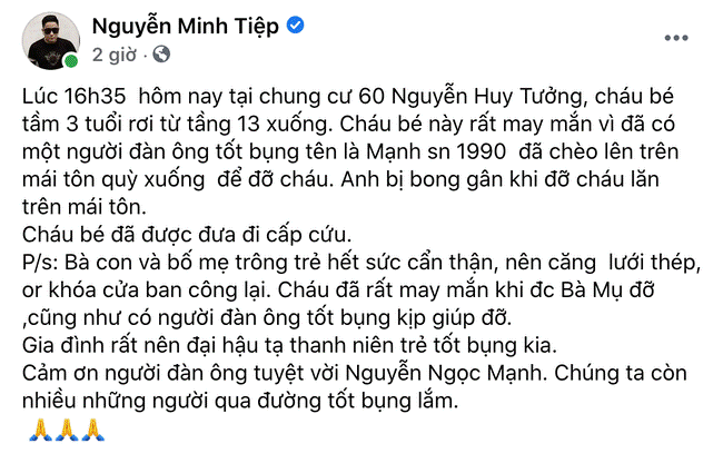 Sự việc bé gái 3 tuổi trèo ra khỏi lan can ban công từ căn hộ tầng 12 của gia đình rồi rơi xuống dưới ở Hà Nội chiều ngày 28/1 đã làm nhiều người kinh hãi, thót tim, nhất là những bậc phụ huynh con nhỏ. Thật may mắn vào thời điểm ngàn cân treo sợi tóc đó, anh Nguyễn Ngọc Mạnh (31 tuổi, trú tại Đông Anh, Hà Nội) đã trèo qua tường bao, lên mái tôn rồi đỡ lấy cháu bé. Nhờ đó mà cháu bé đã thoát khỏi "lưỡi hái tử thần".