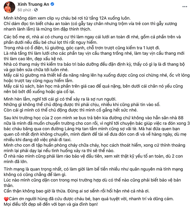Không dám xem clip, chỉ đọc tin và mừng rỡ tim đập thình thịch khi biết cháu bé trong vụ việc nói trên đã an toàn, Đại sứ Áo dài Việt Nam, doanh nhân Trương An Xinh lập tức chỉ ra những điều mà phụ huynh cón con nhỏ cần làm ngay lập tức để đảm bảo an toàn cho bé.