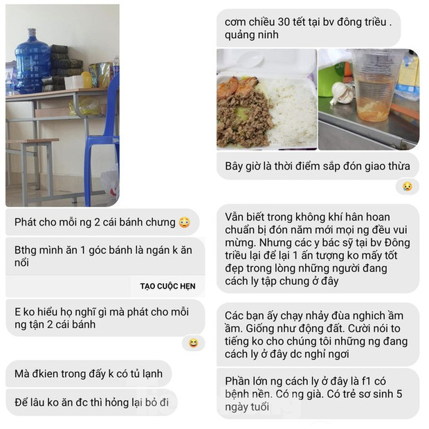 Một bạn đang cách ly ở Đông Triều cho biết, mỗi ngày những người cách ly tại đây được phát 2 chiếc bánh chưng để ăn Tết. Không ăn nổi nên bánh được xếp thành chồng chờ ngày ra viện để bỏ đi. Cũng ở Đông Triều, một số bạn phản ánh cuộc sống sinh hoạt bị ảnh hưởng bởi tiếng ồn.