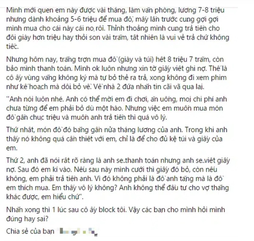 Mình mới quen em này được vài tháng, làm văn phòng, lương 7-8 triệu nhưng dành khoảng 5-6 triệu để mua đồ, mấy lần trước cũng gợi gợi mình mua cho cái này cái nọ rồi. Thỉnh thoảng mình cũng trả tiền cho đôi giày hơn triệu hay thỏi son vài trăm, tất nhiên là vui vẻ trả chứ không tiếc. Nhưng hôm nay, trắng trợn mua đồ (giày và túi) hết 8 triệu 7 trăm, còn bảo mình thanh toán. Mình ok luôn nhưng xin tờ giấy viết ghi nợ. Thế là cô ấy vùng vằng không ký mà tự bỏ thẻ ra trả, xong không đi xem phim như kế hoạch mà dỗi bỏ về. Về nhà 2 đứa nhắn tin cãi vã qua lại. ''Anh nói luôn nhé. Anh có thể mời em đi chơi, ăn uống, mọi chi phí anh chưa từng để em phải bỏ dù một hào. Nhưng việc em muốn mua món đồ gần chục triệu và muốn anh trả tiền thì quá vô lý. Thứ nhất, món đồ đó bằng gần nửa tháng lương của anh. Trong khi anh thấy nó không quá cần thiết với em, chỉ là để cho đủ kệ túi và giầy của em. Thứ 2, anh đã nói rất rõ ràng là anh sẽ thanh toán nhưng anh sẽ viết giấy nợ. Sau đó em kí vào. Nếu sau này mình cưới thì giấy đó bỏ, còn nếu không, em phải trả tiền anh. Vì đó không phải là đồ anh tặng mà là đồ em thích mua. Em thấy vô lý không? Anh không thể đầu tư cho vợ thằng khác được, em hiểu chứ". Nhắn xong thì 1 lúc sau cô ấy block tôi. Vậy các bạn cho mình hỏi mình đúng hay sai? |